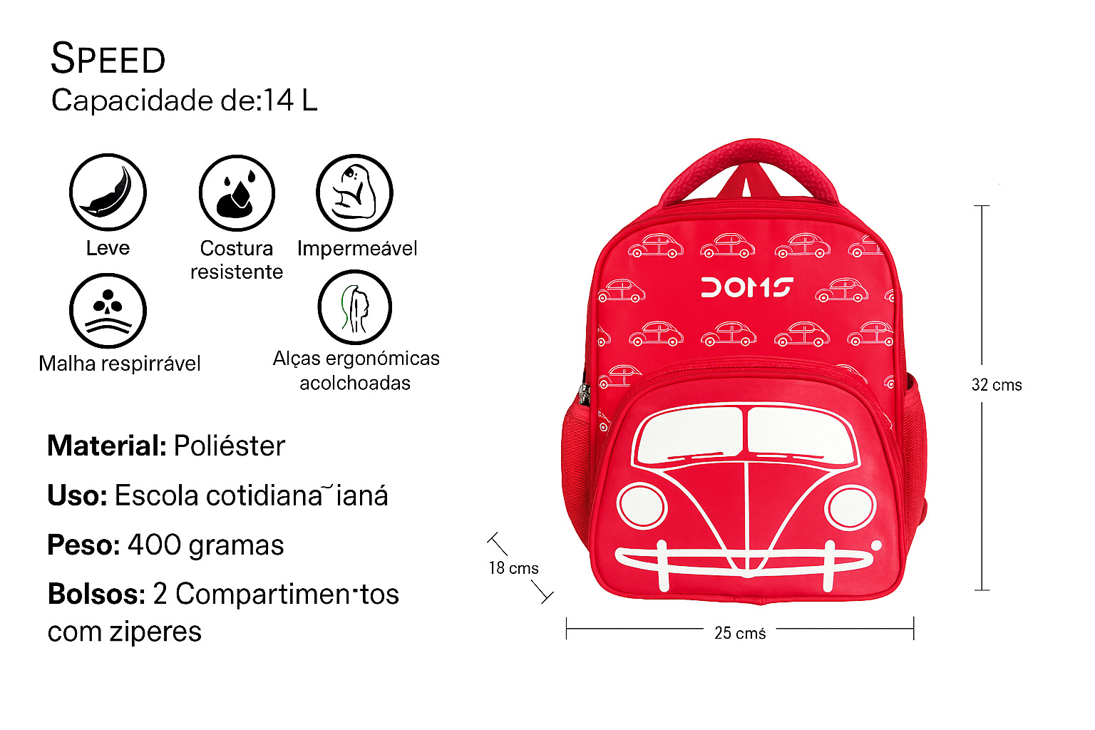Mochila Escolar Infantil Doms Speed é ideal para crianças que adoram velocidade e diversão! Com um design exclusivo inspirado em carros clássicos, esta mochila combina estilo e funcionalidade. Disponível em cores vibrantes (vermelho e azul), ela oferece: