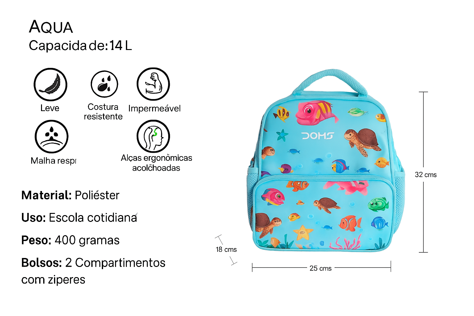 Mochila Escolar Infantil Doms Aqua é perfeita para acompanhar os pequenos no dia a dia escolar com conforto e estilo. Com design colorido e divertido inspirado no mundo aquático, apresenta estampas de peixes, tartarugas e estrelas-do-mar que encantam as crianças. Fabricada com material resistente e leve, possui: