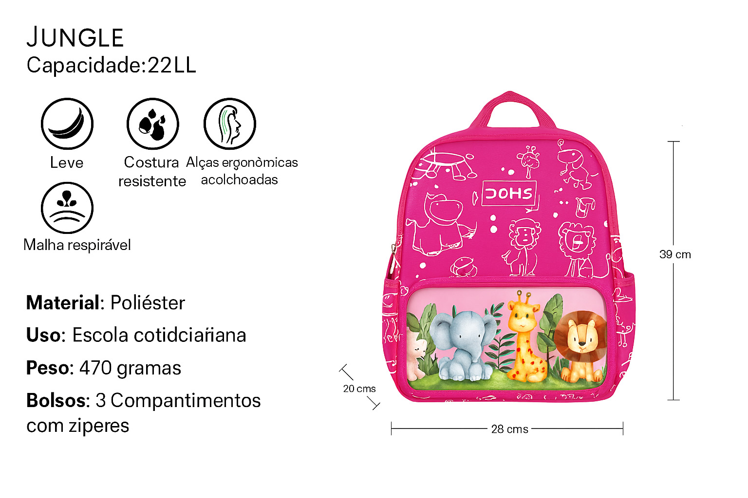 Mochila Escolar Infantil Doms Jungle é perfeita para crianças que adoram aventuras e animais! Com um design divertido inspirado na selva, apresenta estampas encantadoras de elefantes, girafas e leões, tornando a rotina escolar mais alegre. Disponível em cores vibrantes (rosa e azul), esta mochila oferece: