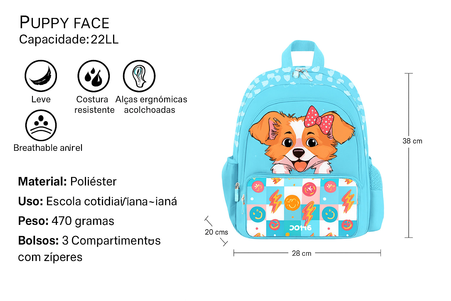 Mochila Escolar Infantil Doms Puppy é perfeita para crianças que amam animais e querem levar alegria para a escola! Com um design encantador de cachorrinho sorridente e detalhes coloridos, esta mochila une estilo e funcionalidade. Disponível em cores vibrantes (azul e rosa), ela oferece: