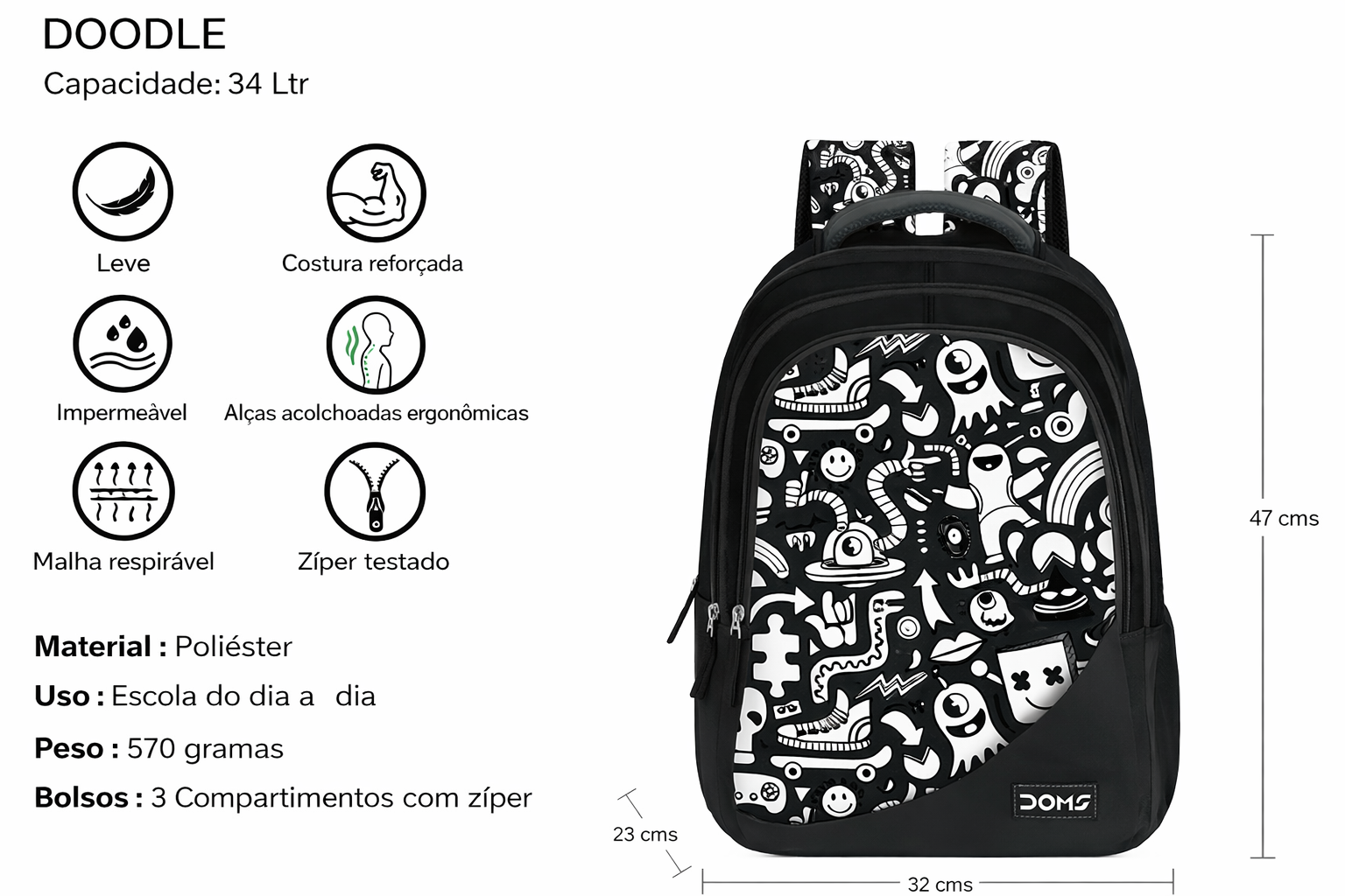 ila Escolar Infantil Doms Doodle é perfeita para crianças que adoram criatividade e estilo! Com um design moderno e estampas divertidas em estilo doodle, esta mochila é ideal para destacar a personalidade dos pequenos. Disponível em várias cores vibrantes (preto, azul, verde e rosa), ela oferece: