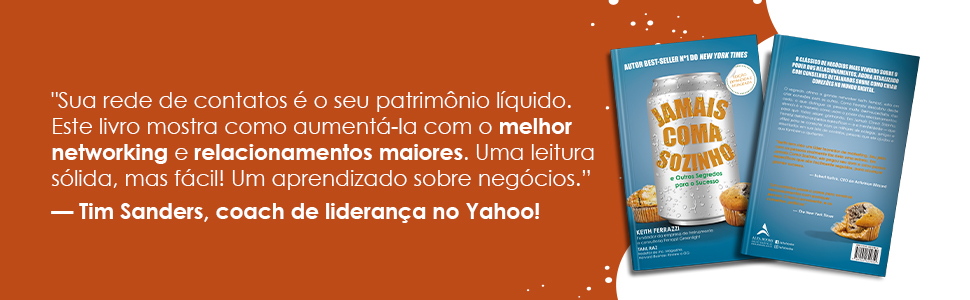 O clássico de negócios mais vendido sobre o poder dos relacionamentos, agora atualizado com conselhos detalhados sobre como criar conexões no mundo digital. O segredo, afirma o grande networker Keith Ferrazzi, está em criar conexões com os outros. Como Ferrazzi descobriu desde cedo, o que distingue as pessoas muito bem-sucedidas das demais é a maneira como usam o poder dos relacionamentos: para que todos saiam ganhando. Em Jamais Coma Sozinho, Ferrazzi detalha os passos específicos ― e a mentalidade ― que utiliza para se conectar com os milhares de colegas, amigos e associados em sua lista de contatos, pessoas que ele ajudou e que também o ajudaram. “Keith tem sido um líder inovador de marketing. Seu jeito com as pessoas realmente faz dele uma estrela. Em Jamais Coma Sozinho, ele pegou seu dom e criou passos específicos que são facilmente seguidos, para alcançar grande sucesso.” ― Robert Kotick, CEO da Activision Blizzard “Um caminho passo a passo para construir relacionamentos com qualquer pessoa. O tom é envolvente, e os conselhos, práticos.”― New York Times