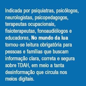 Indicada por psiquiatras, psicólogos, neurologistas, psicopedagogos, terapeutas ocupacionais, fisioterapeutas, fonoaudiólogos e educadores, a obra No mundo da lua tornou-se leitura obrigatória para pessoas e famílias que buscam informação clara, correta e segura sobre TDAH, em meio a tanta desinformação que circula nos meios digitais.