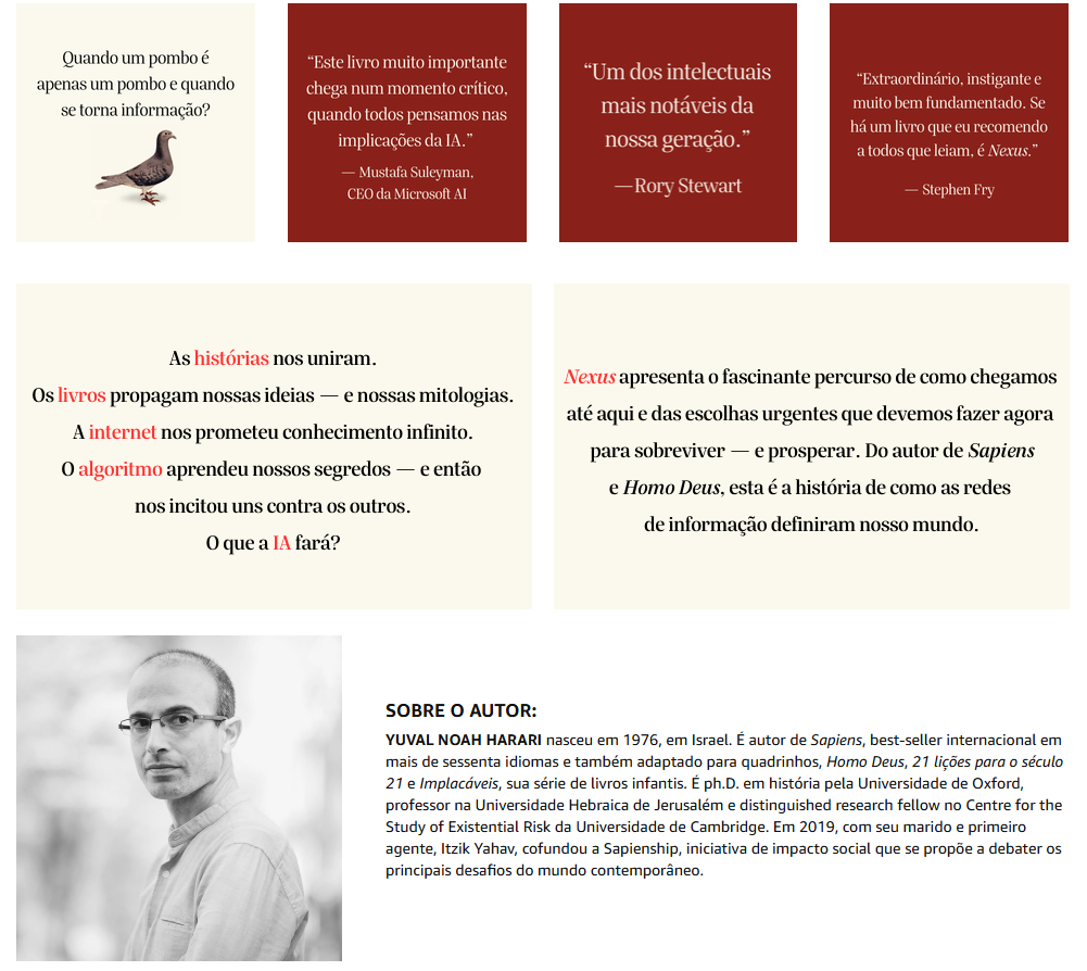 Nexus olha para a nossa história e avalia como o fluxo de informações moldou a nós e o mundo onde vivemos. Em uma narrativa que vai desde a Idade da Pedra e passa pela canonização da Bíblia, pelas primeiras caças às bruxas modernas, pelo stalinismo, pelo nazismo e pelo ressurgimento do populismo hoje, Yuval Noah Harari nos convida a examinar a complexa relação entre informação e verdade, burocracia e mitologia, sabedoria e poder. O autor explora como as várias sociedades e sistemas políticos utilizaram informações para atingir seus objetivos – para o bem e para o mal –, assim como as escolhas que precisamos fazer num momento em que a inteligência não humana ameaça a nossa própria existência.