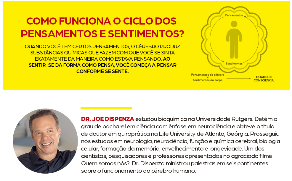 Você não está condenado por seus genes e programado para ser de uma determinada maneira no restante de sua vida. Está emergindo uma nova ciência que habilita todos os seres humanos a criarem a realidade que preferirem. Neste livro, o renomado autor, palestrante, pesquisador e quiroprático Dr. Joe Dispenza combina os campos da física quântica, neurociência, química cerebral, biologia e genética para mostrar o que é realmente possível. Não só você vai ter o conhecimento necessário para alterar qualquer aspecto de si mesmo, mas também receberá as ferramentas, passo a passo, para aplicar o que aprendeu, de modo a promover as mudanças necessárias em qualquer área de sua vida. O Dr. Joe desmistifica os estudos antigos e preenche a lacuna entre a ciência e a espiritualidade. Através de suas eficazes oficinas e palestras, milhares de pessoas em 24 países diferentes têm utilizado esses princípios para mudar de dentro para fora. Quando você quebra o hábito de ser você mesmo e realmente muda sua mente, sua vida jamais será a mesma!