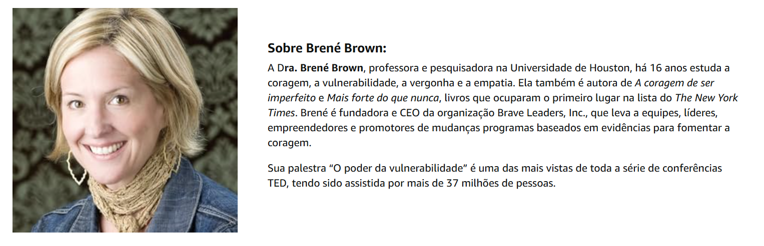 A Dra. Brené Brown, professora e pesquisadora na Universidade de Houston, estuda há duas décadas a coragem, a vulnerabilidade, a vergonha e a empatia. Escreveu os livros A coragem de ser imperfeito, Mais forte do que nunca e Eu achava que só acontecia comigo, que ocuparam o primeiro lugar da lista dos mais vendidos do The New York Times. Apresentadora de dois podcasts premiados, Unlocking Us e Dare to Lead, passa a maior parte do tempo atuando em organizações ao redor do mundo, ajudando a desenvolver líderes mais corajosos e culturas organizacionais mais ousadas. Em 2024, foi nomeada diretora executiva do Center for Daring Leadership, na BetterUp. Sua palestra “O poder da vulnerabilidade” é uma das mais vistas de toda a série de conferências TED, tendo sido assistida por mais de 60 milhões de pessoas.