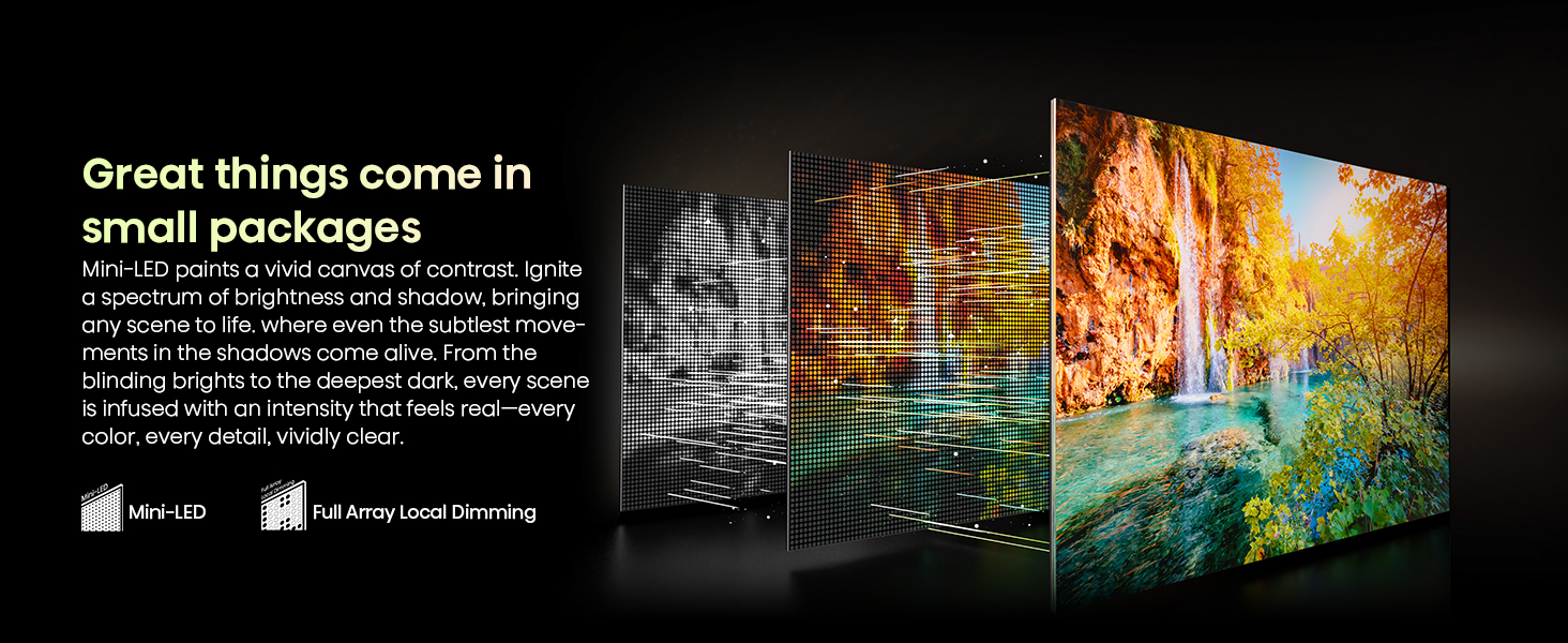 A TV suporta os principais formatos de HDR, incluindo Dolby Vision IQ, HDR10+, HLG e Filmmaker Mode, e conta com Full Array Local Dimming para contraste aprimorado. O áudio é reforçado com Dolby Atmos e potência de 30W, criando uma experiência sonora envolvente. Para gamers, oferece Game Mode Plus, VRR e ALLM, garantindo jogabilidade fluida e responsiva. O design é moderno e sem bordas, com acabamento em preto e suporte a montagem VESA.