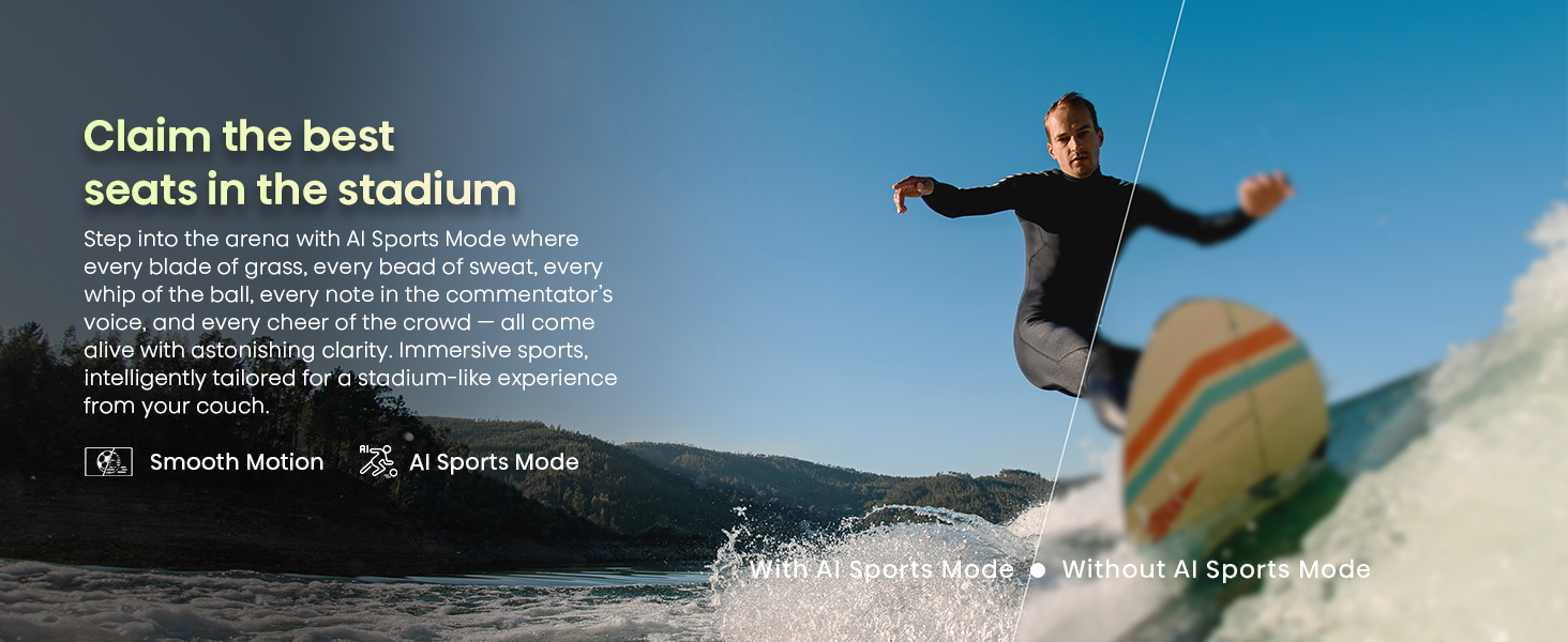 Modos especiais: Game Mode Plus, AI Sports Mode, Parental Control, Sleep Timer;