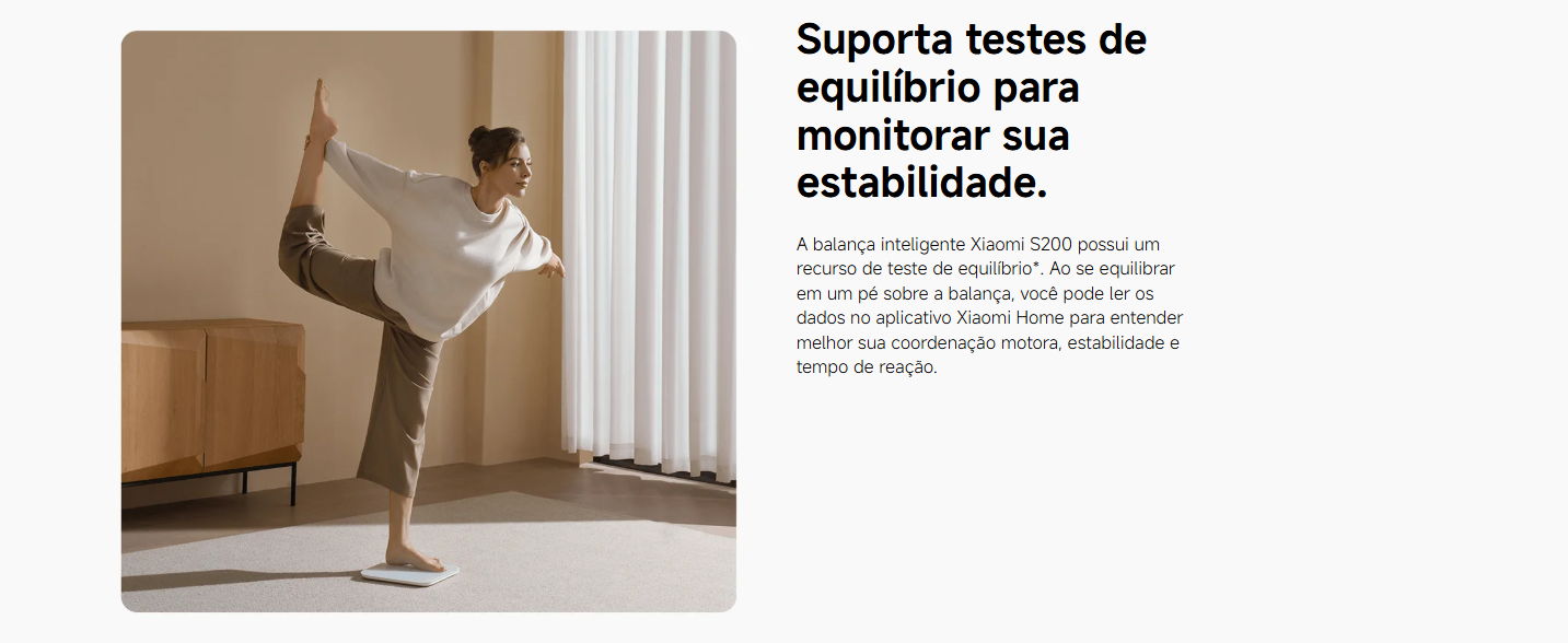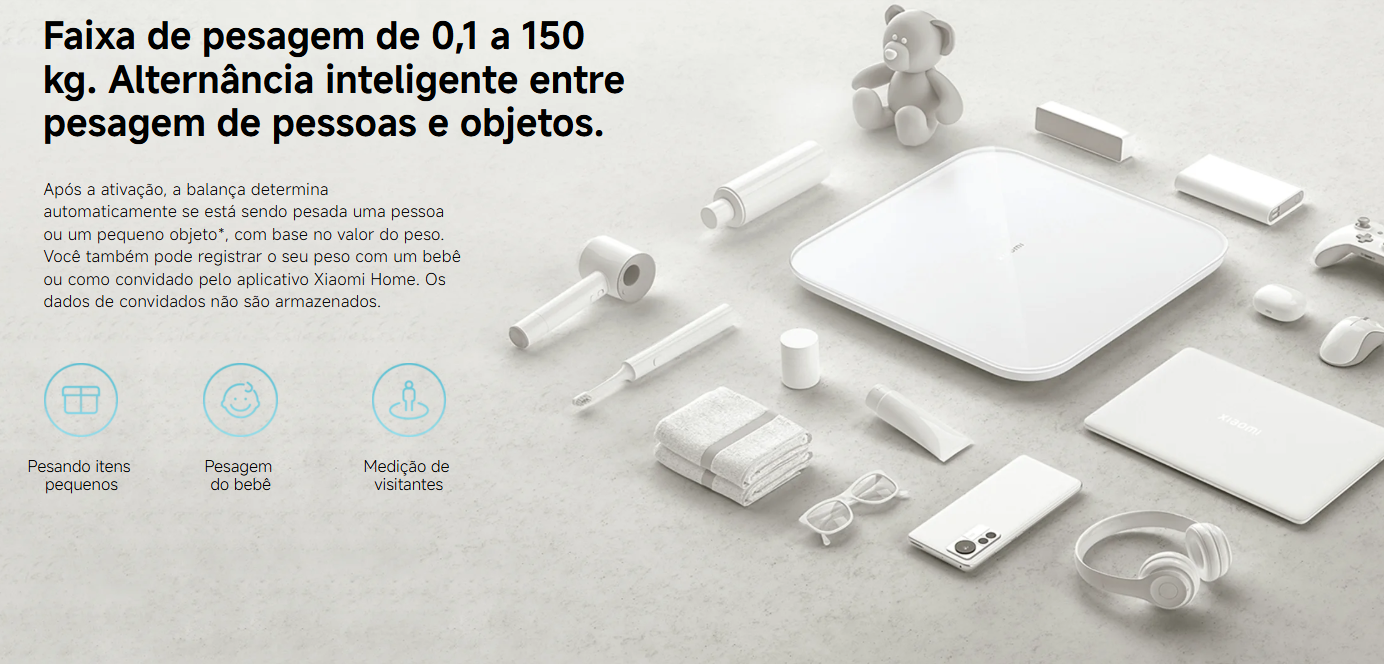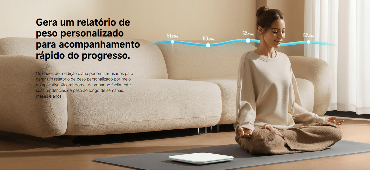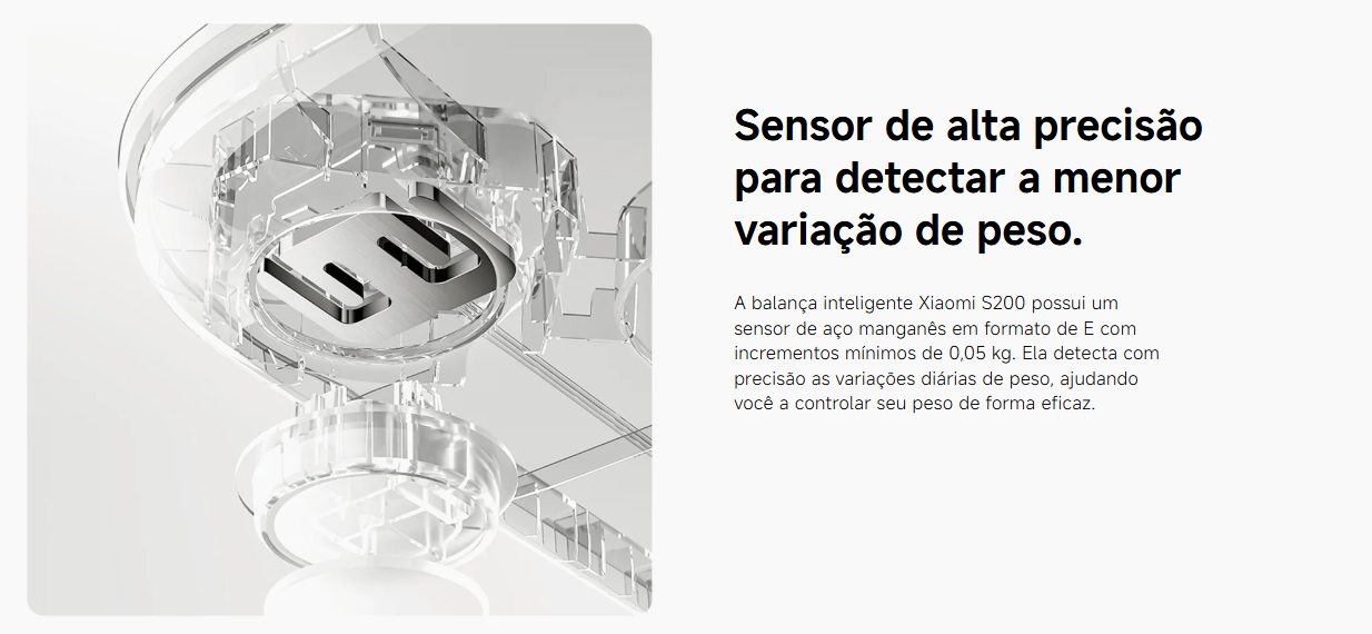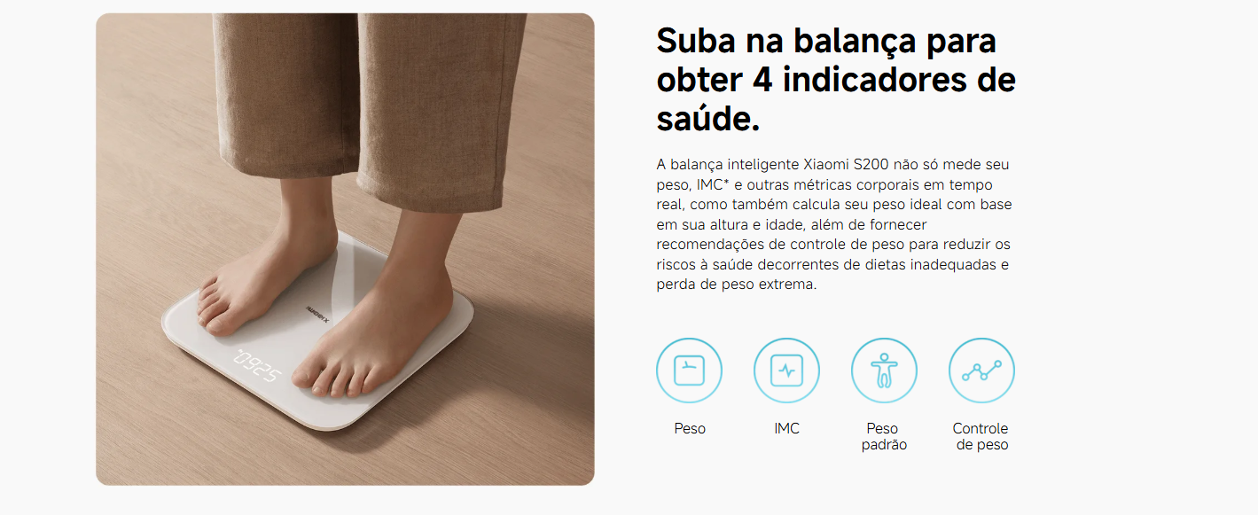 Experimente precisão e estilo com a Balança Inteligente Xiaomi S200, uma balança digital sofisticada que combina funcionalidade com design moderno. Com uma elegante estrutura em vidro temperado e plástico de engenharia, esta balança inteligente mede 280 x 280 x 24,5 mm e pesa apenas 1,2 kg. Com seus sensores de alta precisão, ela mede com exatidão pesos de 0,1 a 150 kg em incrementos de 0,05 kg. A S200 se conecta via Bluetooth 5.4 ao seu smartphone (compatível com Android 8.0 ou iOS 12.0 e versões superiores), permitindo que até 36 usuários acompanhem suas medições pelo aplicativo Xiaomi Home.