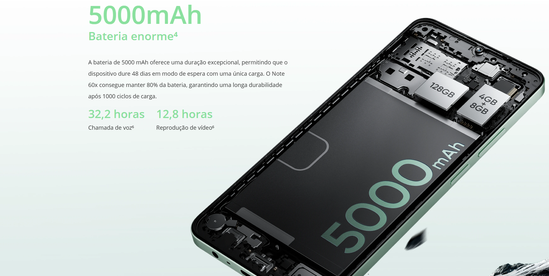 Bateria de 5000 mAh de longa duração: Desfrute de mais tempo em movimento sem preocupações, com carregamento rápido que garante energia sempre que precisa.
