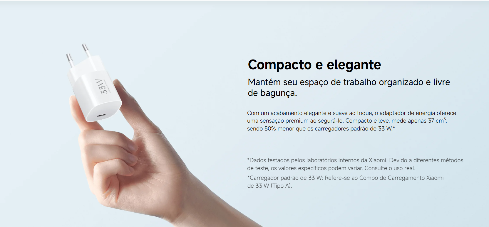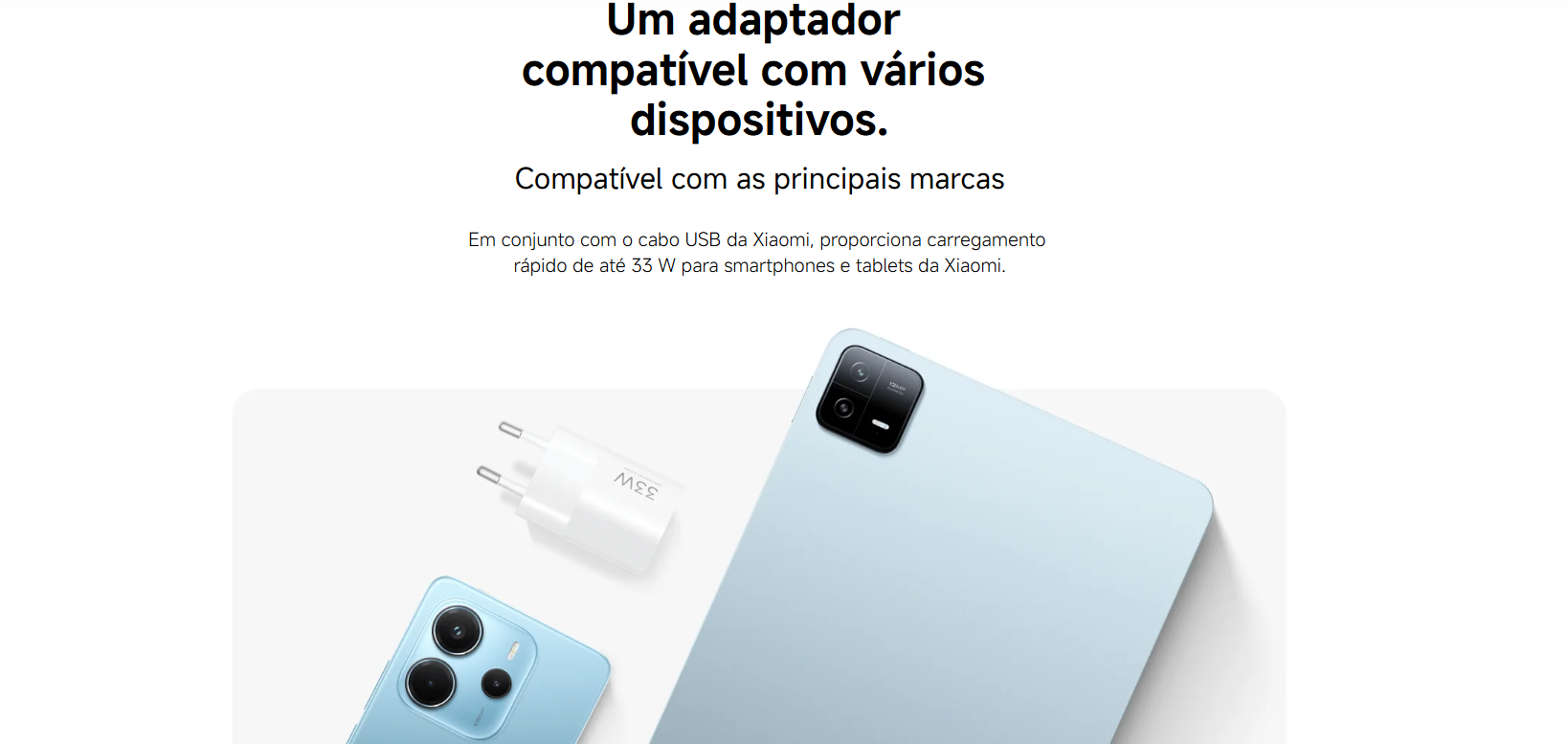 Tecnologia de carregamento rápido GaN, carregamento rápido com design leve. A tecnologia de carregamento rápido GaN (nitreto de gálio) reduz o tamanho e o peso do carregador, ao mesmo tempo que melhora a eficiência da conversão de energia, proporcionando velocidades de carregamento mais rápidas. Um único adaptador compatível com vários dispositivos, compatível com marcas populares. Combinado com o cabo USB da Xiaomi, fornece carregamento rápido de até 33 W para smartphones e tablets. Chip inteligente integrado. Detecta automaticamente os dispositivos conectados e suporta os protocolos de carregamento rápido QC/PD/PPS. Não só é otimizado para produtos Xiaomi, como também é compatível com smartphones e outros dispositivos de marcas como Apple e Samsung.