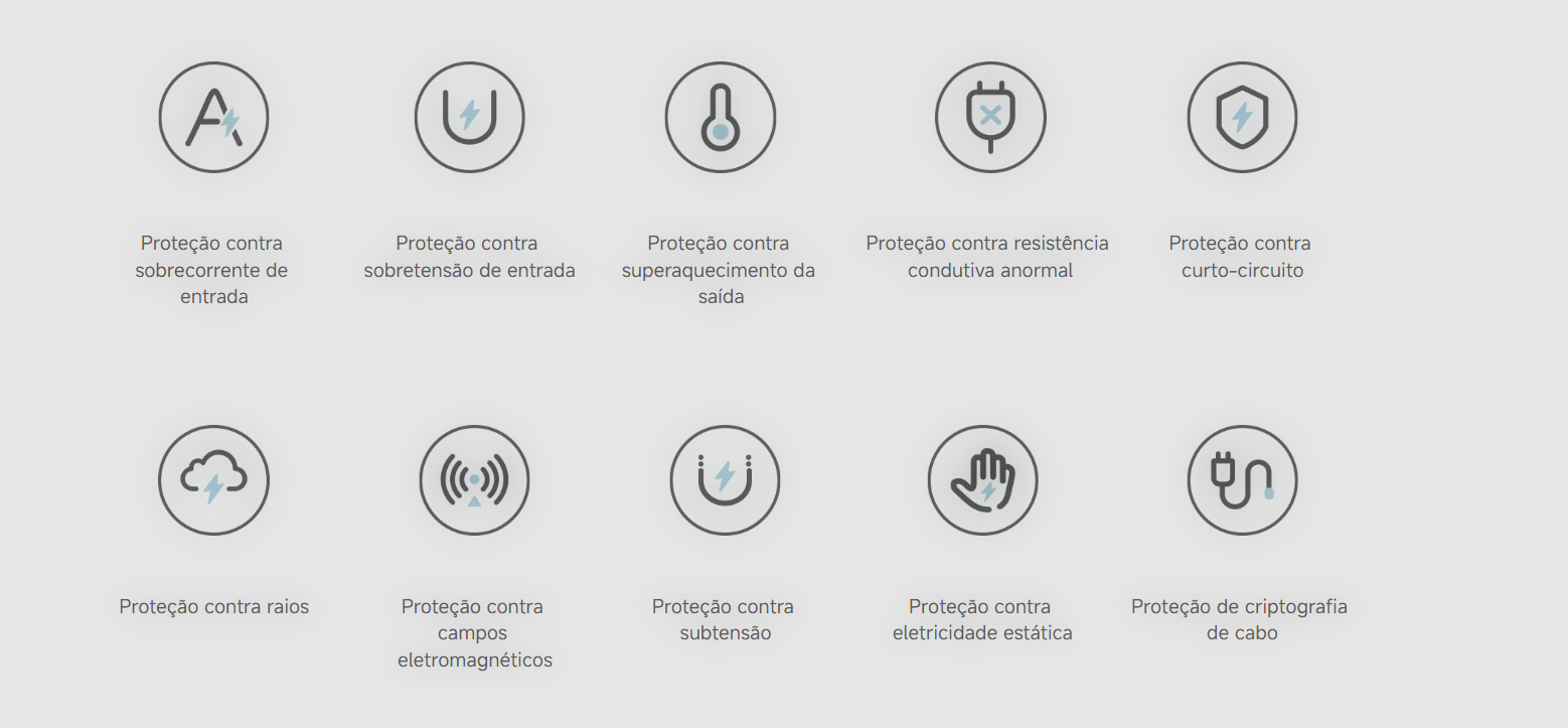 A carcaça resistente a chamas e ao calor garante o uso seguro, mesmo durante o carregamento noturno. O controle inteligente de temperatura reduz o calor gerado durante o carregamento, prolongando a vida útil da bateria, enquanto diversos recursos de segurança oferecem proteção completa.