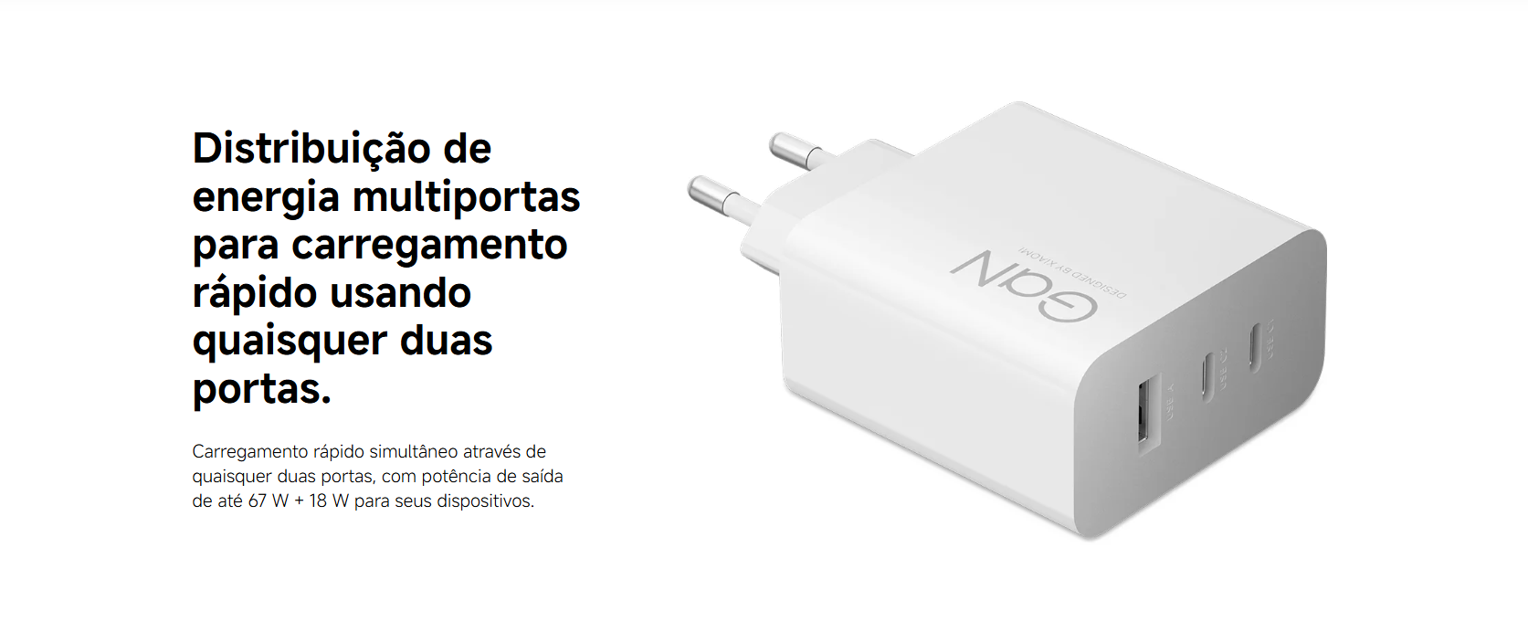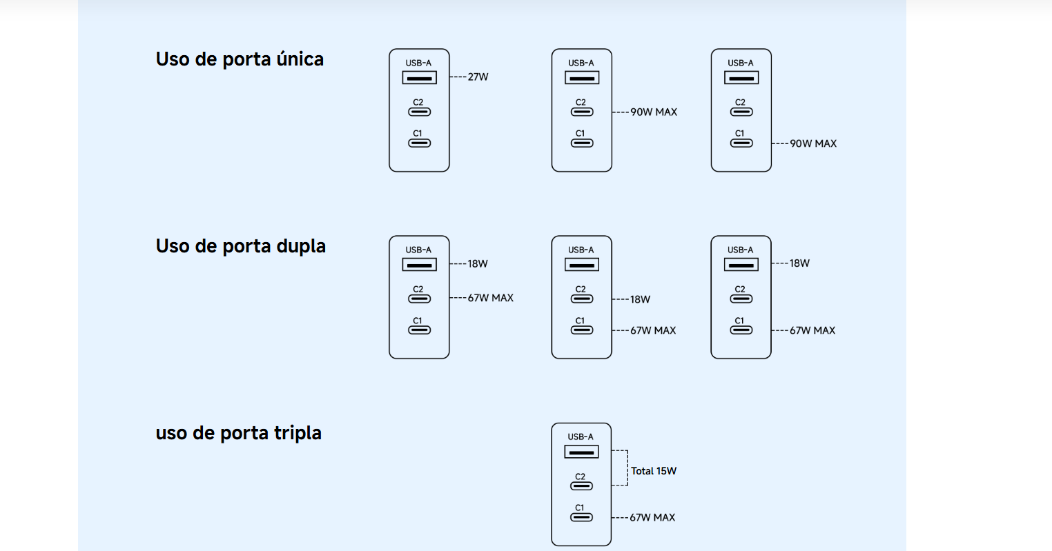 Com 3 portas (1× USB-A + 2× USB-C), permite carregar telemóveis, tablets, laptops compactos, powerbanks e outros dispositivos de forma rápida e inteligente — tudo ao mesmo tempo.
