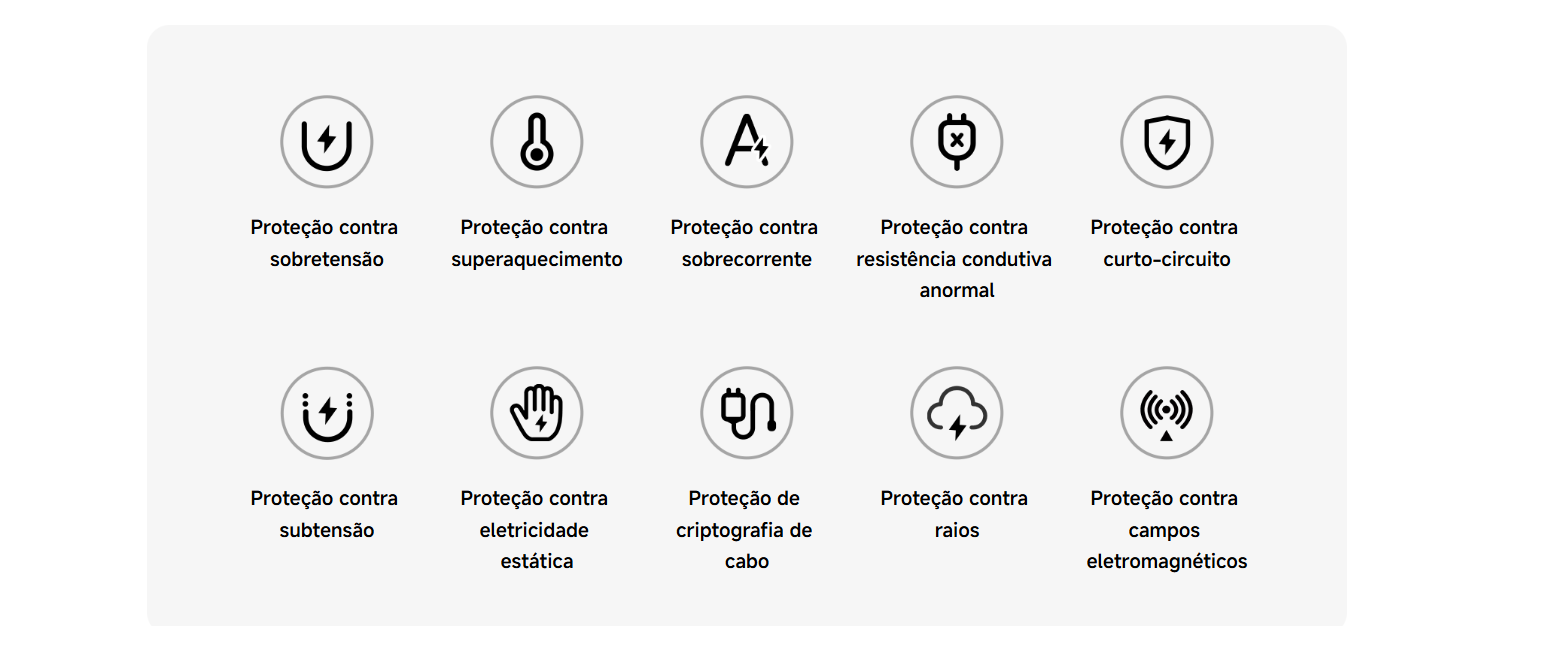 A caixa é fabricada com materiais resistentes a altas temperaturas e retardantes de chamas de grau UL94-V0, enquanto o carregador possui controle inteligente de temperatura e múltiplas proteções para garantir segurança e confiabilidade.
