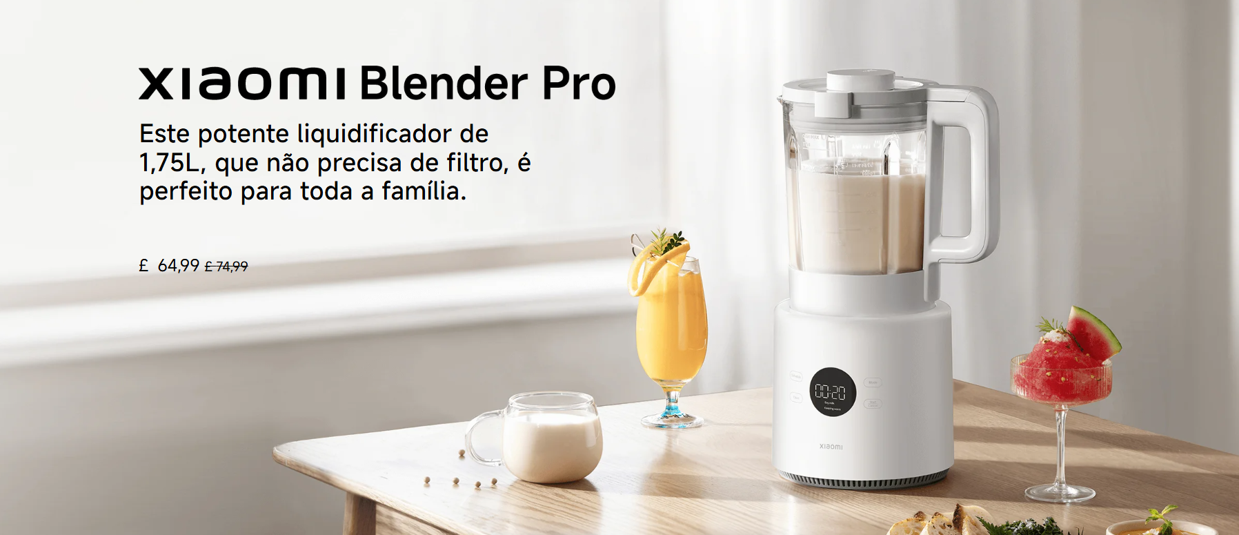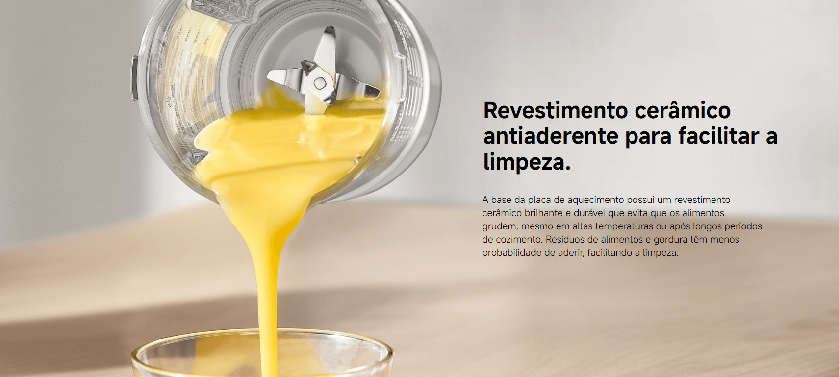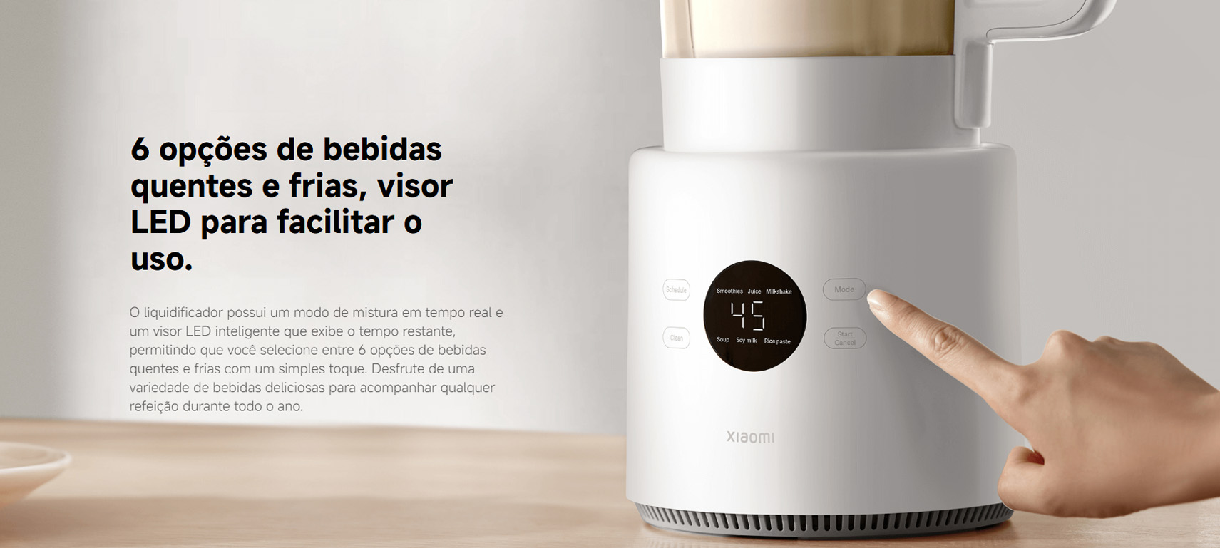 Opções de bebidas quentes e frias: O menu de um toque permite preparar smoothies, sopas, sucos, leite de soja, pasta de arroz e milkshakes — com entrega de bebidas quentes e frias durante todo o ano.
