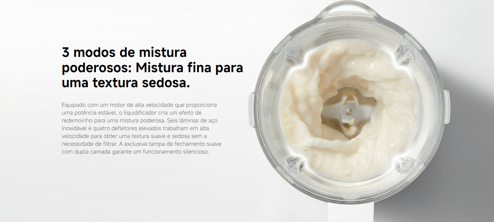 Três modos de mistura potentes: Mistura fina para texturas sedosas e suaves, sem necessidade de filtrar. Motor de alta velocidade e seis lâminas de aço inoxidável trituram gelo e misturam os ingredientes com eficiência.