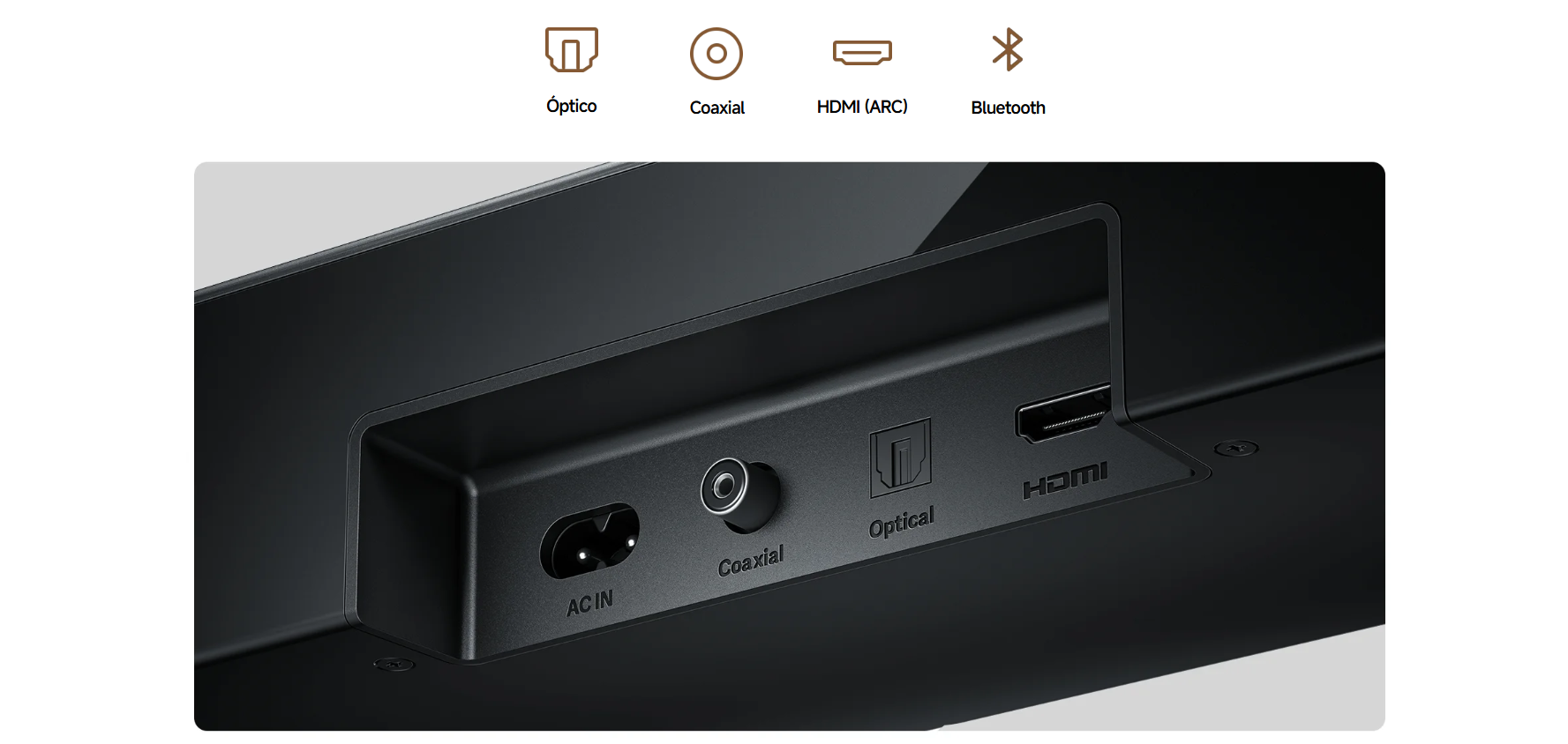 Oferece diversas opções para conexão prática a TVs, computadores e smartphones, como óptica, coaxial, HDMI (ARC) e Bluetooth*, para atender às suas necessidades de entretenimento.