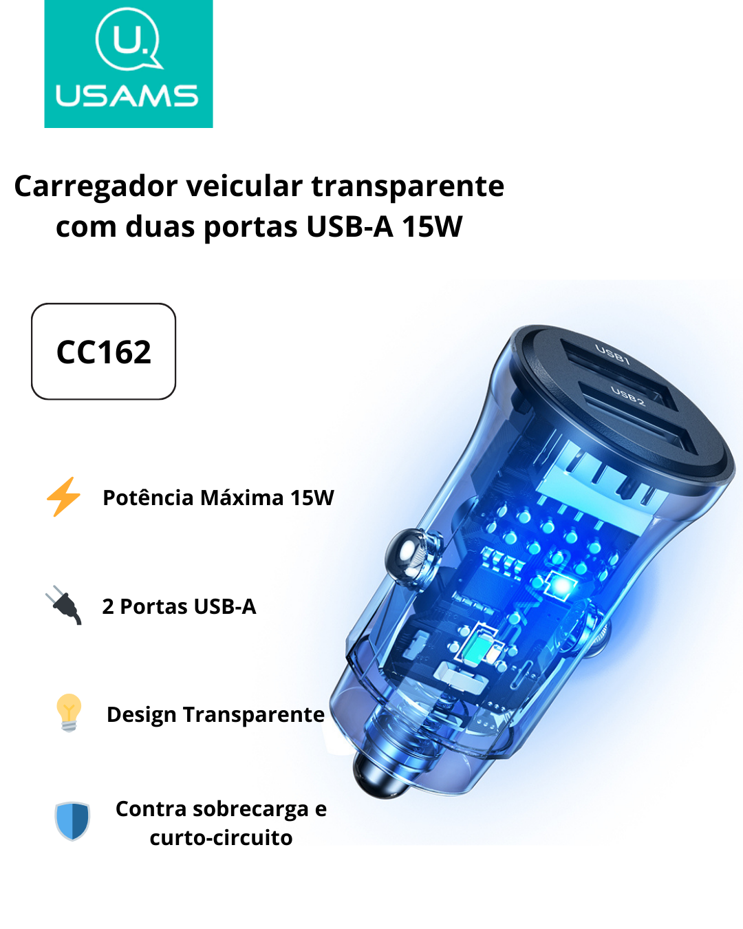 O Carregador Veicular Mini US-CC162 combina praticidade, eficiência e segurança. Ele permite carregar múltiplos dispositivos simultaneamente, mantendo-os protegidos contra falhas elétricas. Ideal para uso diário, viagens longas ou qualquer situação em que a energia rápida seja necessária. Compacto, moderno e confiável, é a escolha perfeita para quem não quer ficar sem bateria durante o dia.