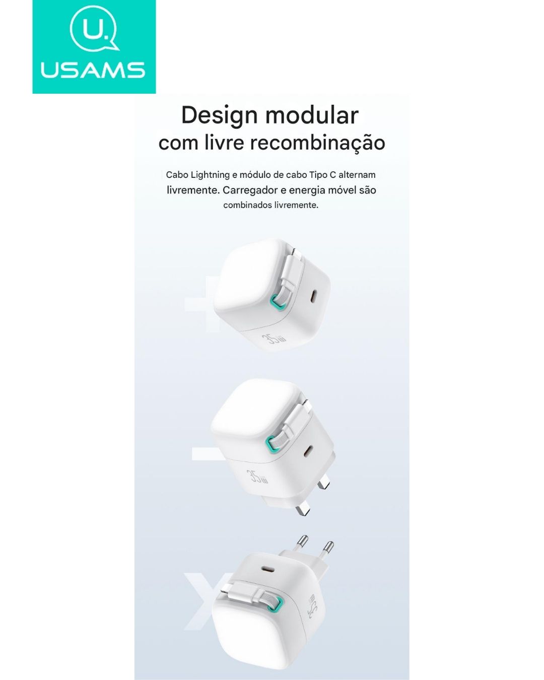 O US-CC202 é um carregador rápido de alta eficiência com potência de 35W, equipado com duas portas USB-C e cabo magnético retrátil integrado, proporcionando praticidade e organização. Compacto, ideal para viagens e disponível nas cores Preto e Branco com plug EU.