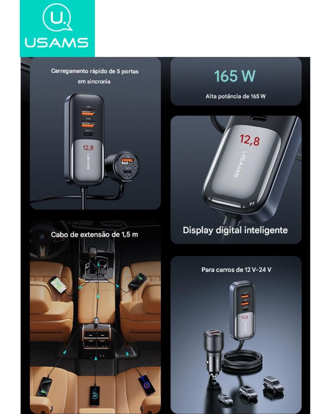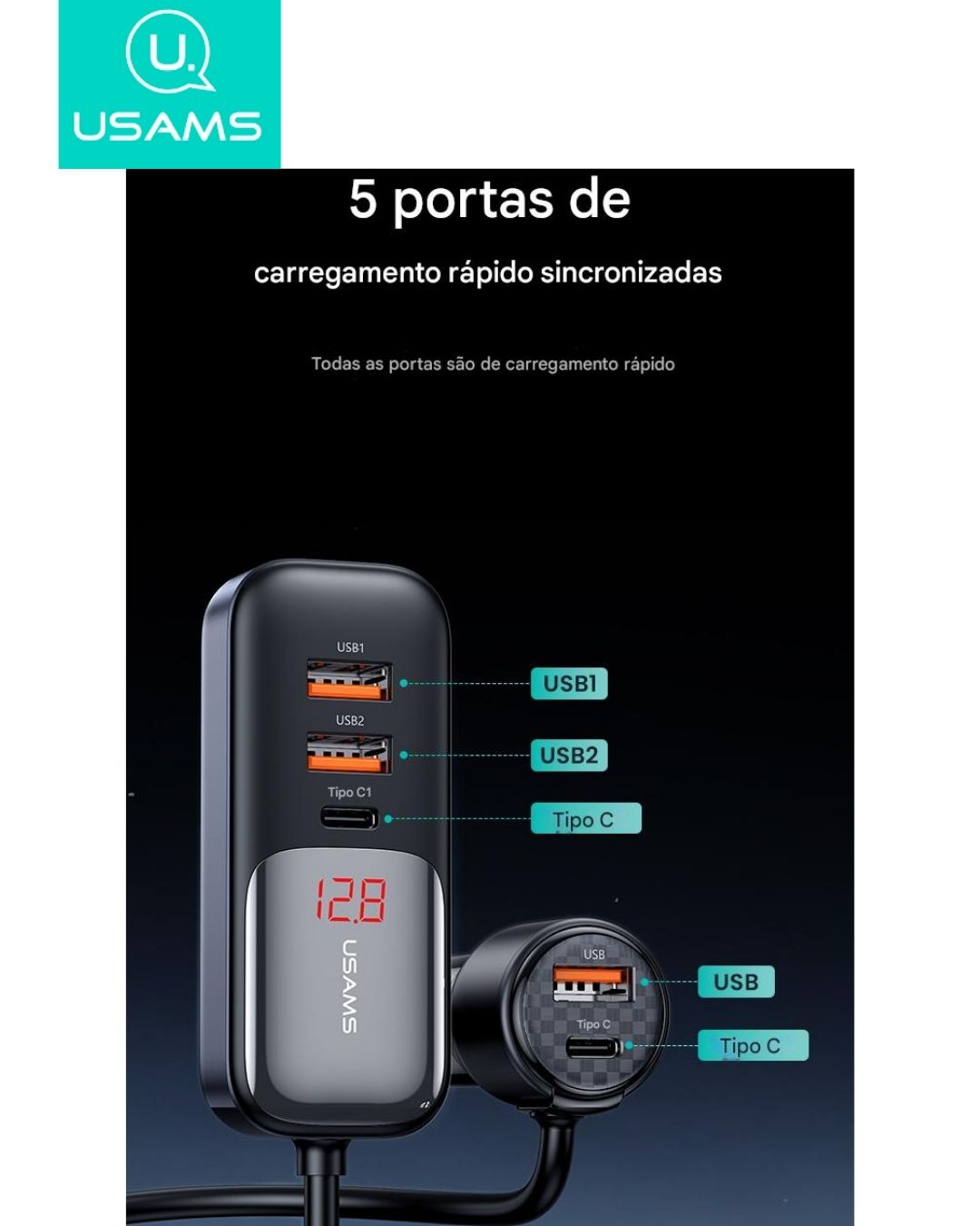 O Kit Carregador Veicular US-CC213 C40 165W é ideal para quem precisa de carregamento rápido, seguro e eficiente para múltiplos dispositivos no carro. Com 5 portas, suporte a PD, QC e PPS, e display digital inteligente, você monitora a voltagem e corrente em tempo real.