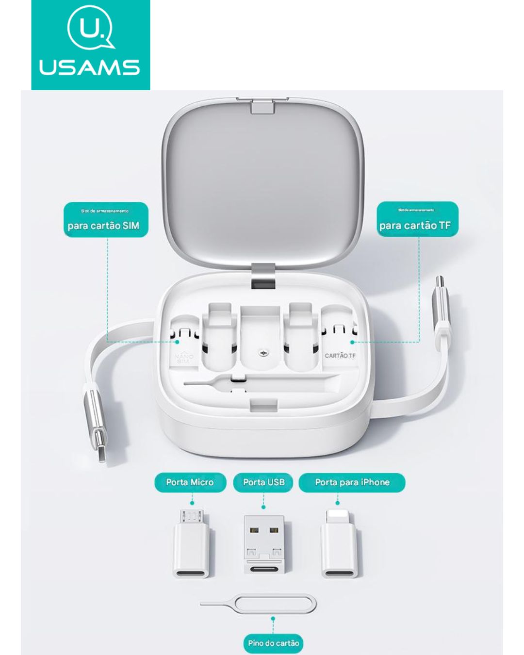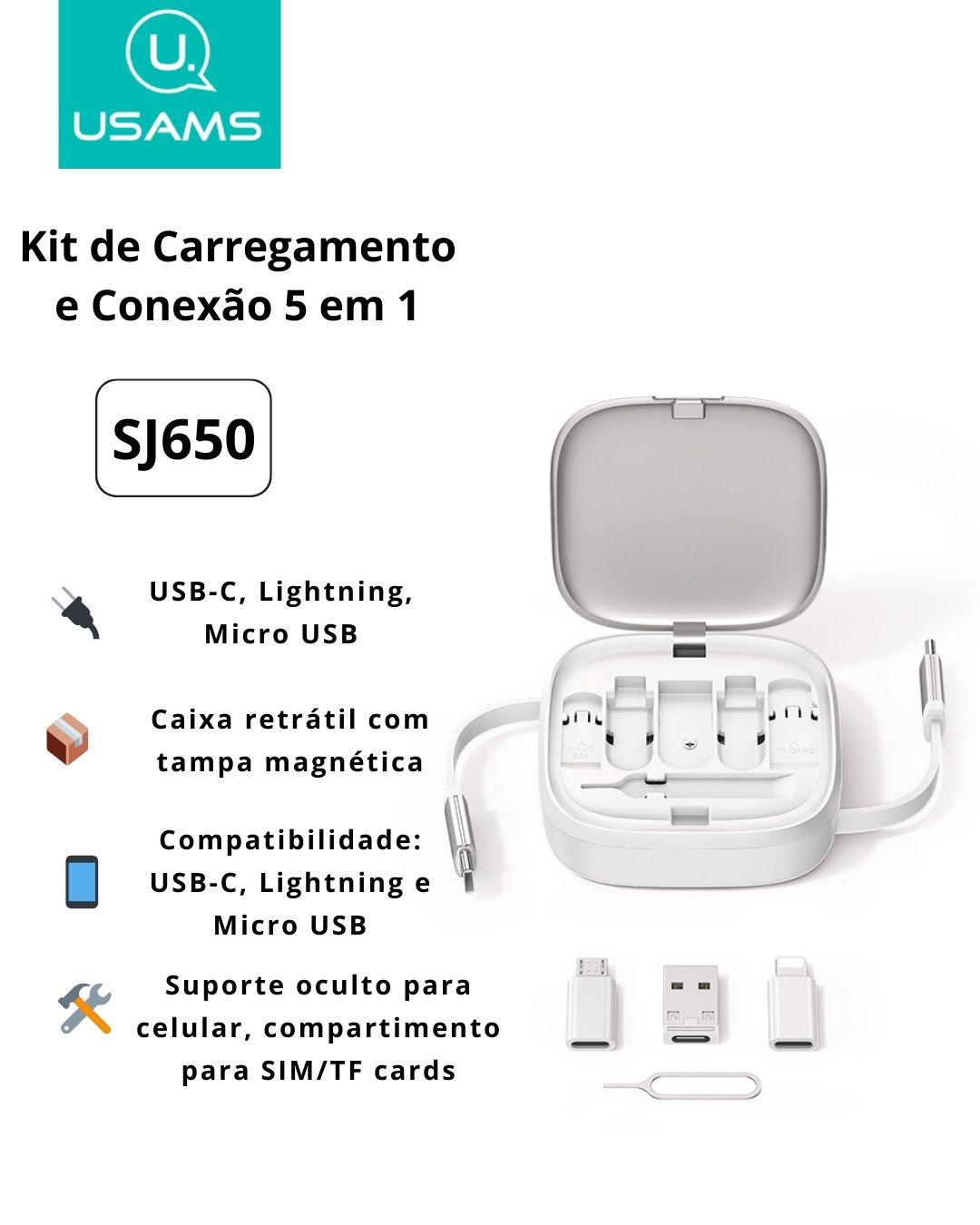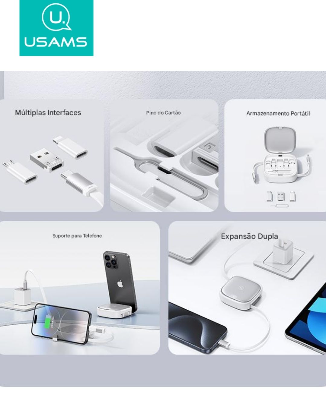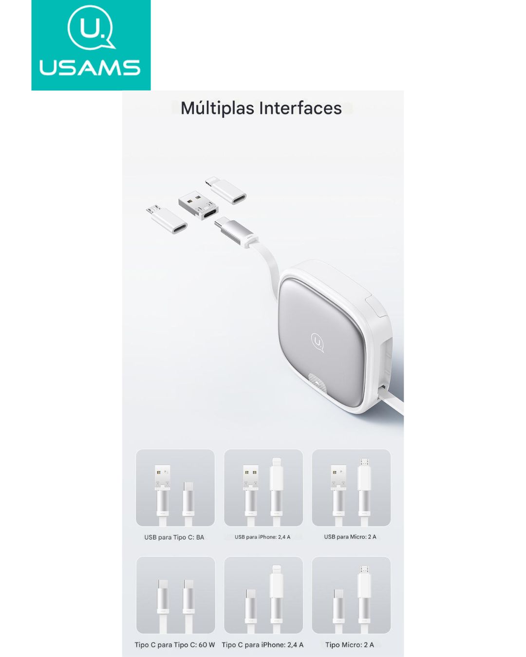 O USAMS U87 é a solução ideal para quem busca praticidade, versatilidade e desempenho. Este cabo retrátil de 1 metro vem integrado a uma caixa compacta e elegante que oferece 6 interfaces diferentes, tornando-o compatível com a maioria dos dispositivos modernos, incluindo smartphones, tablets, laptops e pequenos eletrodomésticos.