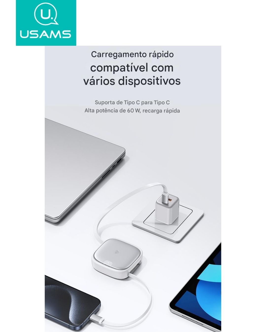 Potência de até 60W, compatível com celulares, tablets e notebooks USB-C. Menos tempo preso à tomada, mais liberdade para você trabalhar, estudar ou se divertir.