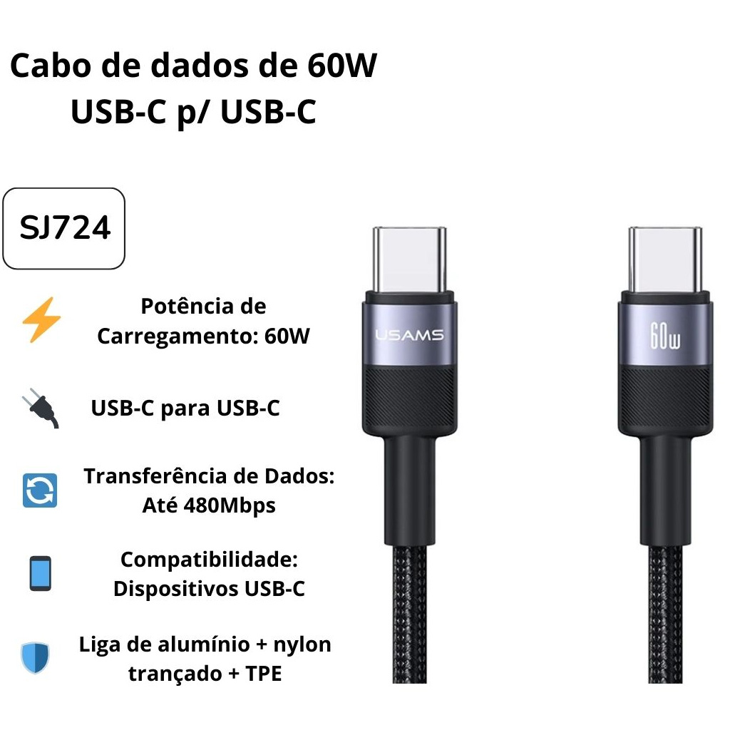 Cabo US-SJ724 60W Tipo-C para Tipo-C em Alumínio – Série SY