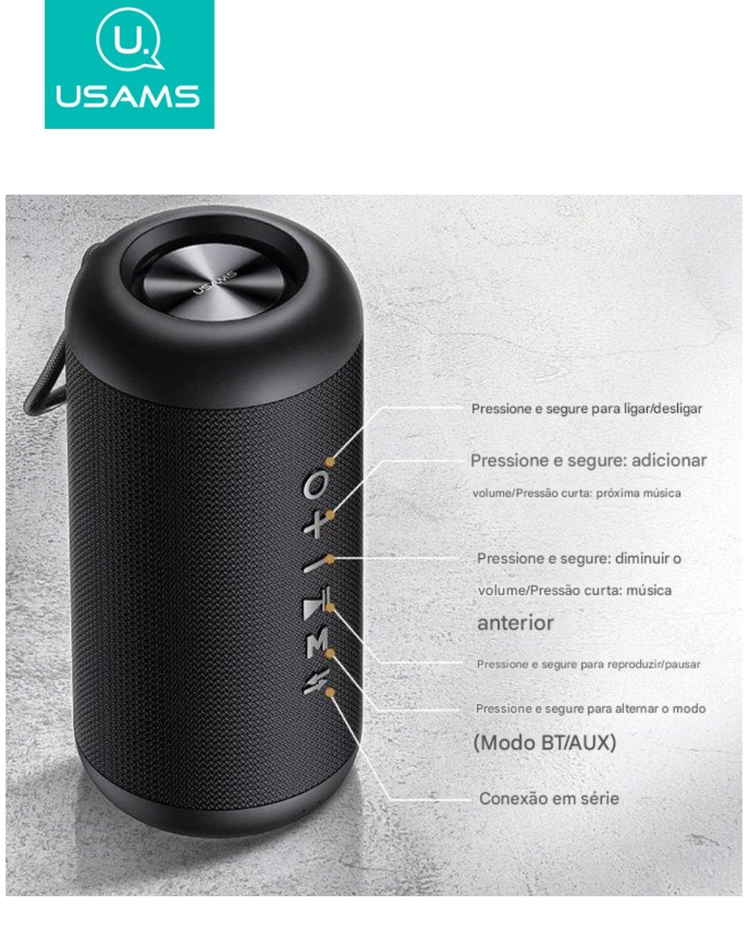 Entradas/Portas: AUX 3,5 mm, porta microUSB (carregamento e reprodução);