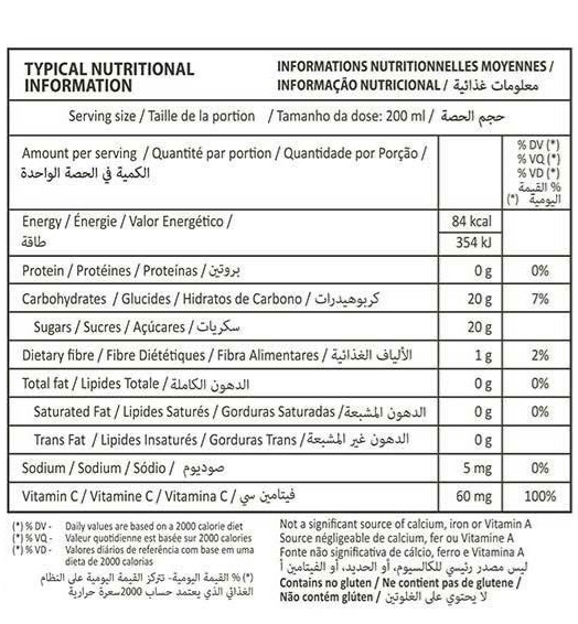 Ingredientes: Suco de maçã, Purê de goiaba, Suco de uva, Suco de abacaxi, Purê de mamão, Purê de pêssego, Purê de manga, Suco de maracujá, Vitamina C (E300).